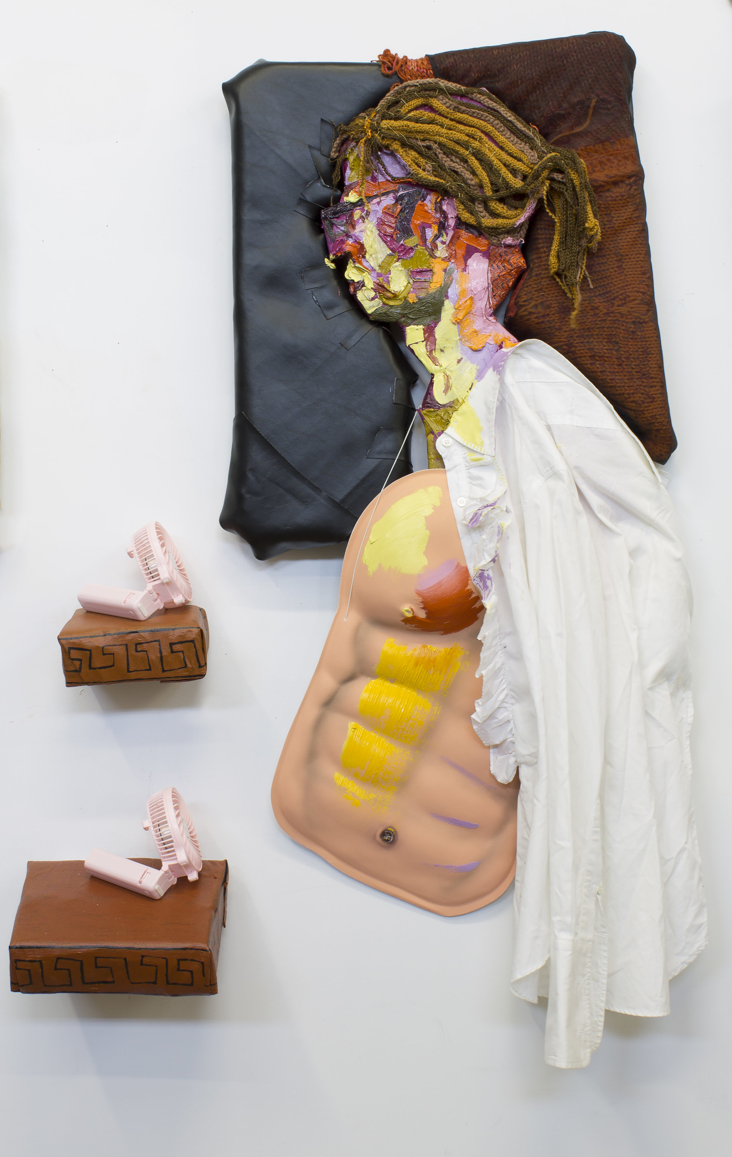 Oil, upholstery foam, fabric, canvas, thread, shirt, costume chest, wood and fans.
