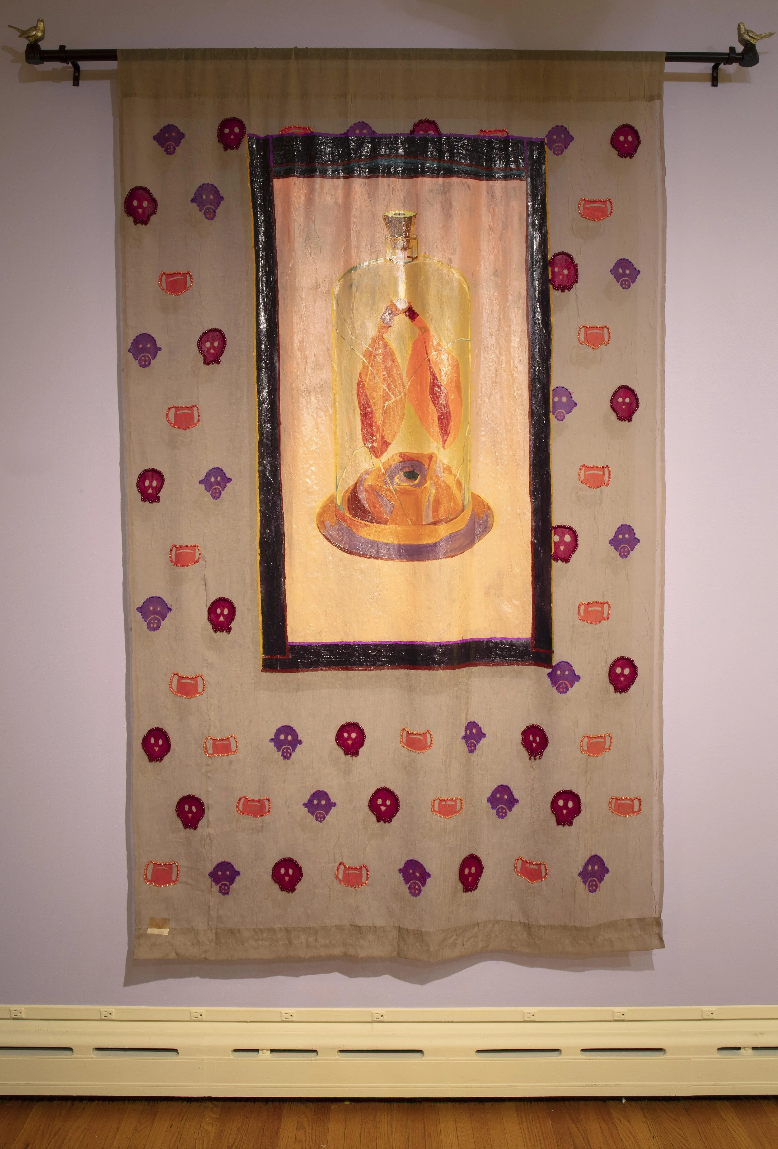 Acrylic and oil on curtain, embroidered and sequined birds, beads, bird curtain rod.